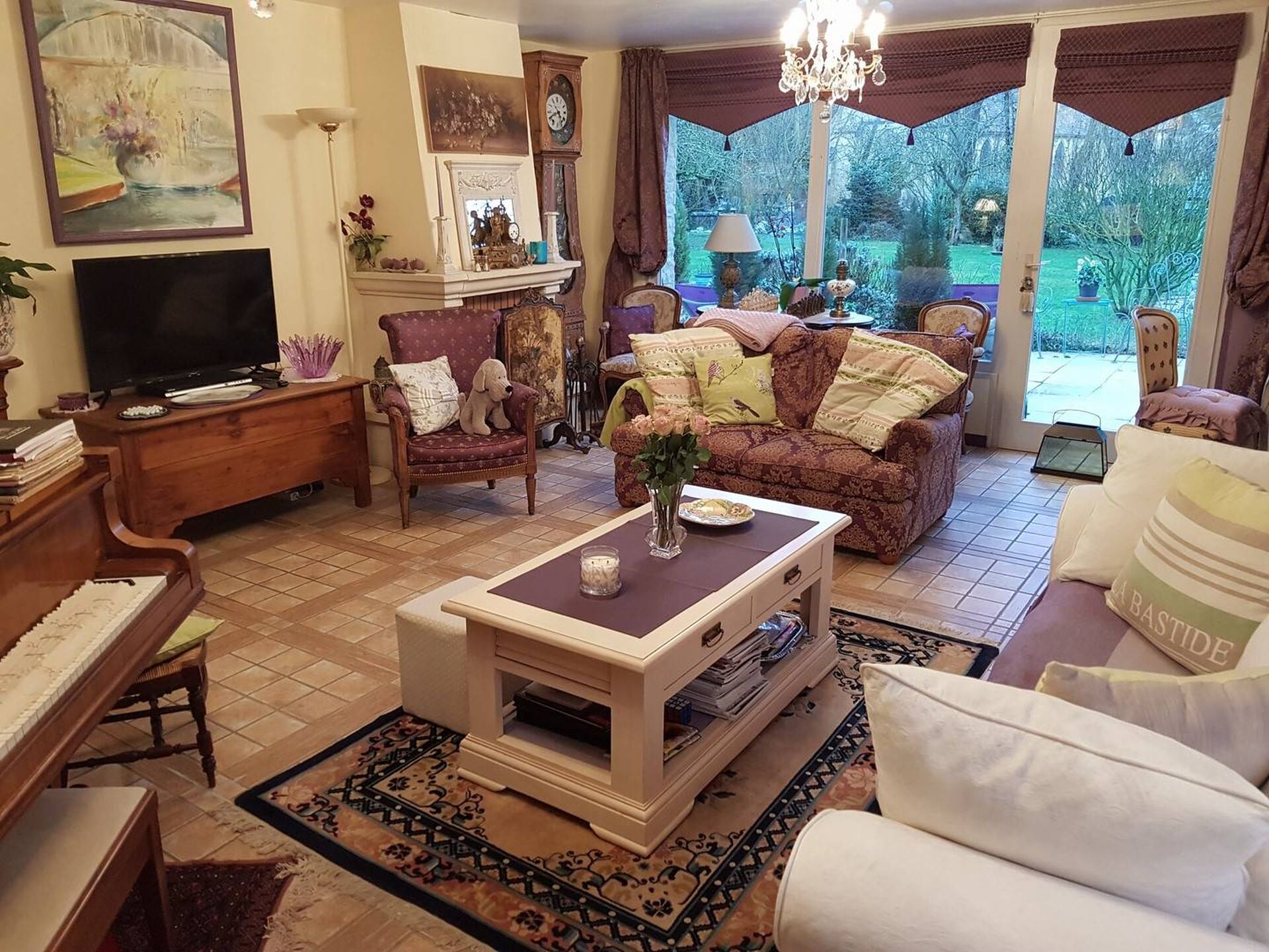 alt="Salon et cheminée donnant sur la terrasse" title="Salon et cheminée donnant sur la terrasse"/>